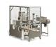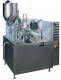 Automatic packaging machine is designed for packaging liquids and paste-type food products (e.g. sour cream, cream, melted cheese etc.) and cups made from polymeric with ring shape edge over the cup with diameter of 75 or 95 mm, polymeric lids from laminated foil thermally wedded layer.